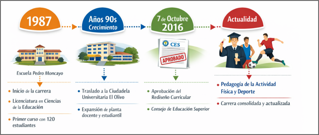 En aquel contexto histórico de finales de la década de los ochenta, el sistema educativo regional enfrentaba un déficit crítico: una vasta proporción de los docentes que impartían la asignatura de educación física en los colegios de nivel medio carecían de una titulación formal de tercer nivel que avalara sus competencias pedagógicas. Para solventar esta imperiosa necesidad de profesionalización, el Honorable Consejo Universitario resolvió la creación del “Instituto de Educación Física”. Este instituto asumió la responsabilidad histórica de ofertar la Licenciatura en Ciencias de la Educación con especialidad en Educación Física y Complementación Educativa.